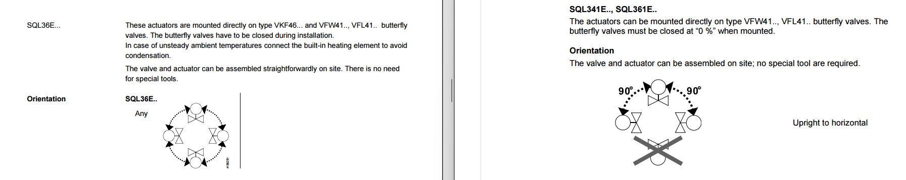 SQL341E.., SQL361E.. Electromotive actuators can be mounted directly on VFL41.., WFW41.. butterfly valves